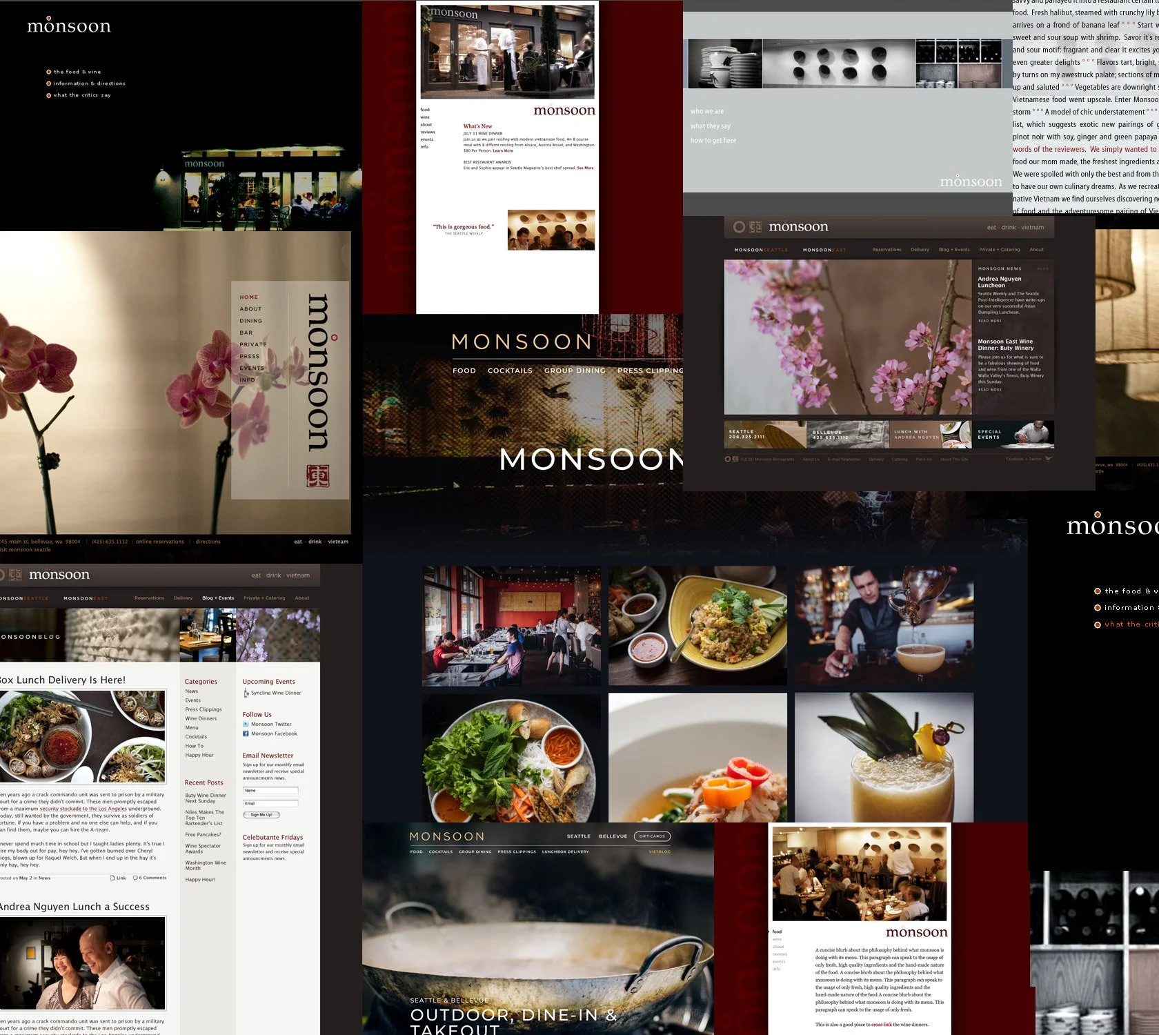 This website and the entire Saigon Siblings brand is designed, illustrated, photographed, and managed by Geoffrey Smith of LookatLao Studio in Seattle. Back in the olden times (late 1990s), Geoffrey was designing and developing websites while moonlighting as a waiter at the very first Monsoon in 1999. The Banh siblings decided to hire him to design the very first Monsoon website (image below, top left), which had a total of three pages. The payment for this project was one bottle of a very rare Zind-Humbrecht Gewurztraminer. At least five different versions were to follow over the years, and this one is probably the last. These days you can find Mr. Smith riding off into the sunset…